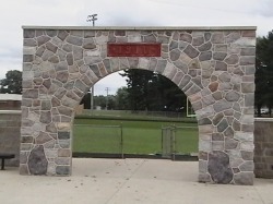 The historical arch at the entrance to the football field and track was reconstructed from the 1910 Athens school.